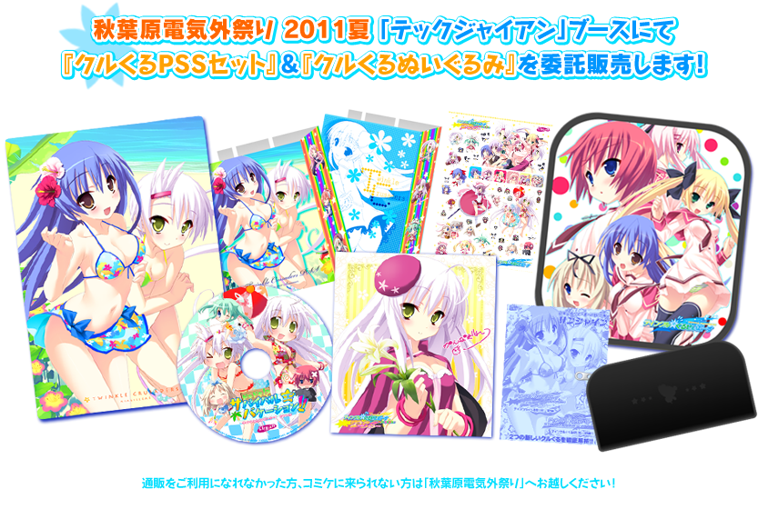 物販コーナーでは、夏コミ新作「クルくるPSSセット」の委託販売も極少数ですがご用意しています。 |
