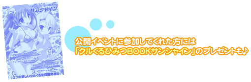 公開イベントに参加してくれた方には、「クルくるひみつBOOKサンシャイン」をプレゼントしちゃいますよ。 |