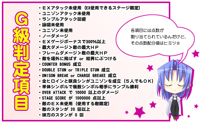 条件をみたした項目の点数値の合計をもって、各ステージの規定の点数を満たせばオッケーよ!